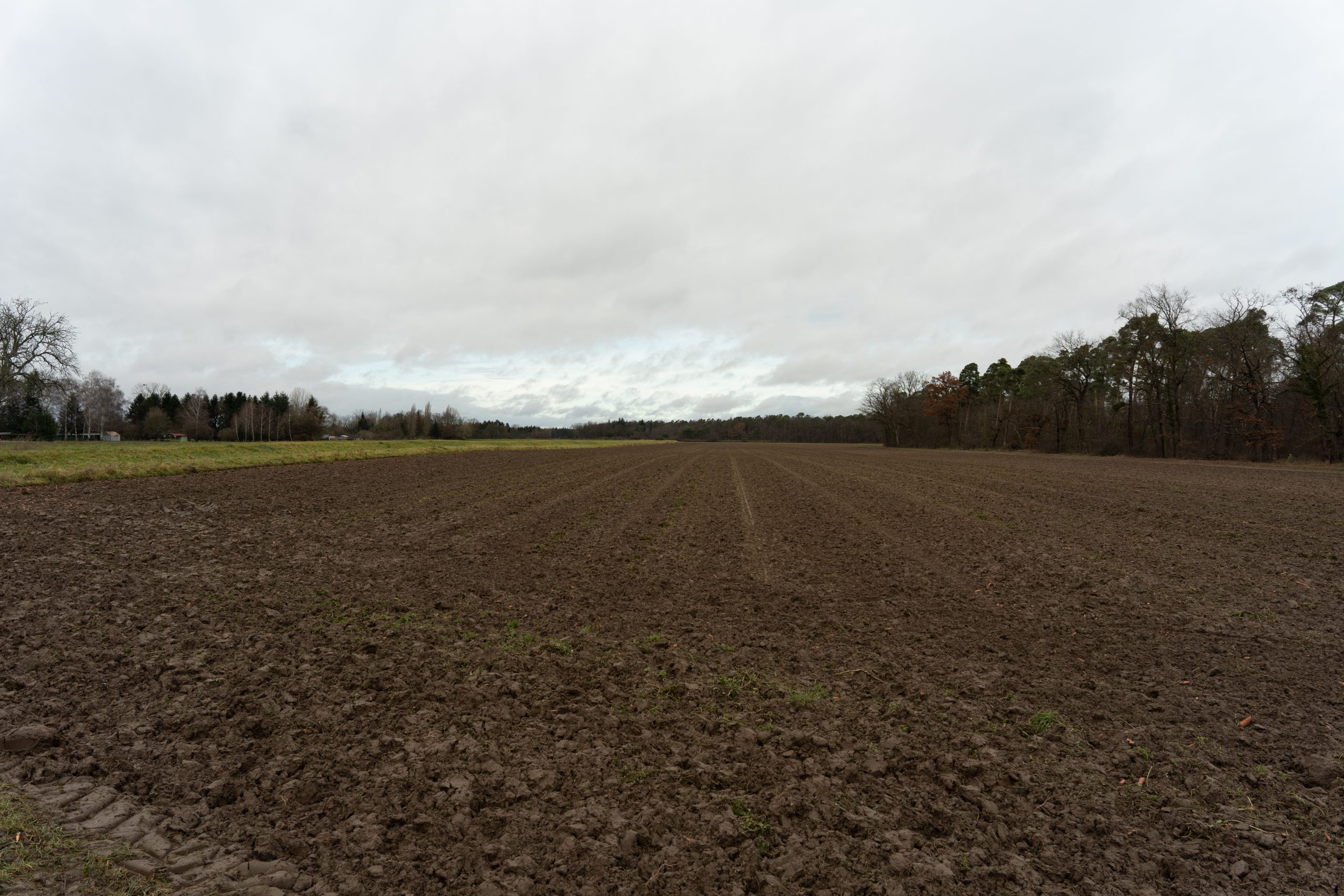 Ein Foto eines Ackers. An den beiden Rändern sieht man Bäume, am Horizont klart der sonst graue Himmel etwas auf.