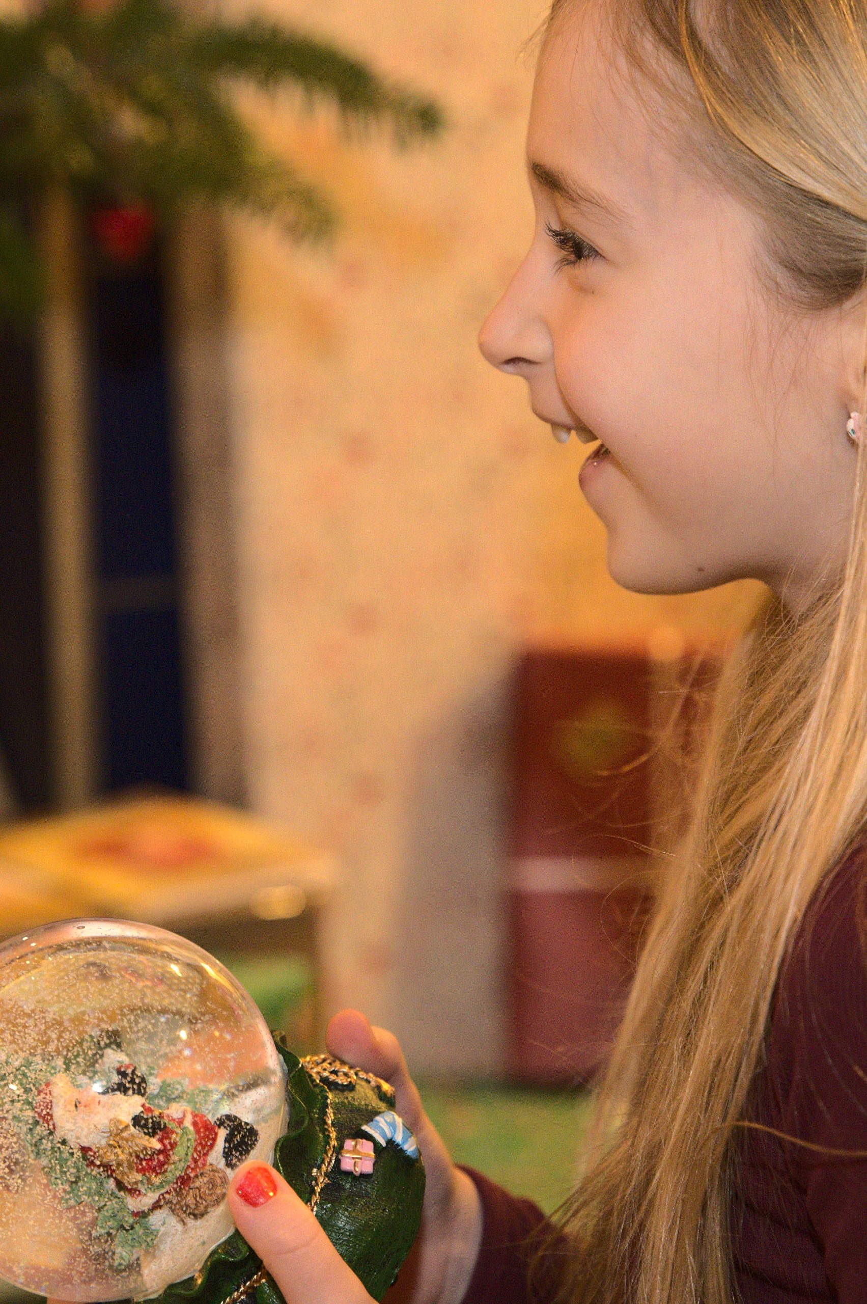Schneekugelglück Ein Kind freut sich über eine Schneekugel, die es zu Weihnachten geschenkt bekommen hat