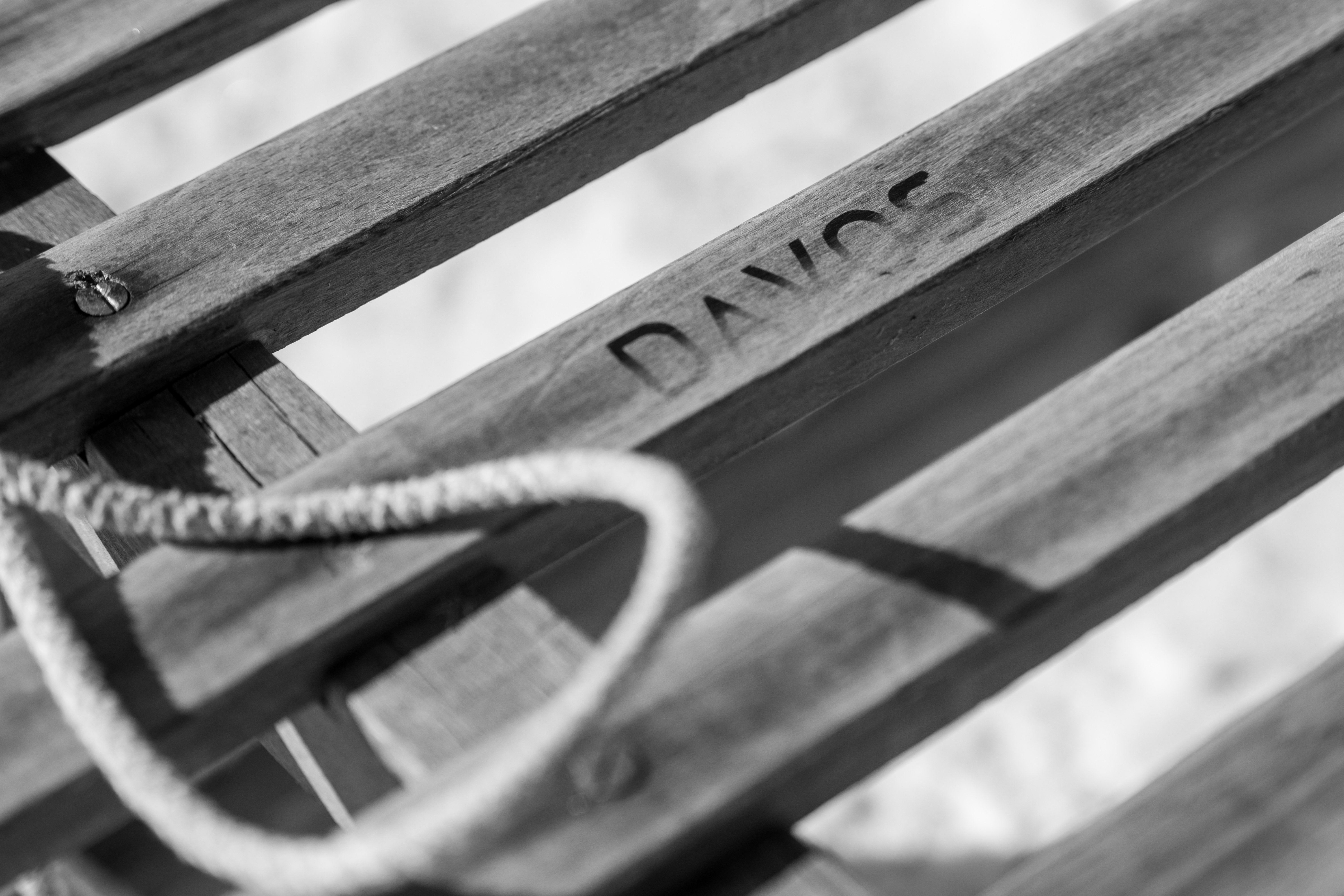 Eine Detailaufnahme meines alten Holzschlitten in schwarz weiß