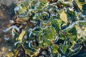 Man sieht Pflanzen eines Ackers am Rhein unter einer klaren Eisschicht